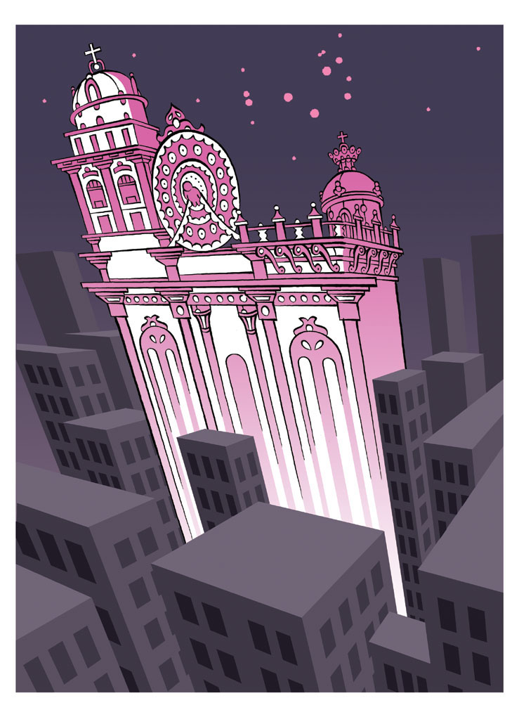 Oorspronkelijk was het idee bedoeld om als schilderij uit te werken. Maar de schildermaterialen zijn reeds enkele jaren geleden aan de wilgen gehangen. De nog aanwezige ideeen zijn nu weer opgediept om te worden uitgewerkt als digitaal ingekleurde tekening, zoals deze. De afgebeelde kerk is een gestileerde versie van een reisschets uit Guatemala.